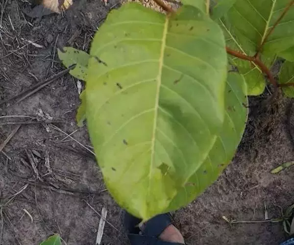 落叶大乔木,高达30米;树干通直,基部略有板状根;树皮薄,灰褐色,老时有裂隙且粗糙;枝平展,幼枝略扁,褐色,老枝圆柱形,灰色。叶对生,薄革质,椭圆形或长圆状椭圆形,长15-25厘米,宽7-12厘米,顶端短尖,基部圆形或截形,萌蘖枝的幼叶长50-60厘米,宽15-30厘米,基部浅心形,上面有光泽,下面无毛或被稠密短柔毛;叶柄长2-3厘米,粗壮;托叶披针形,长约12毫米,跨摺,脱落。