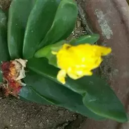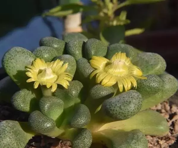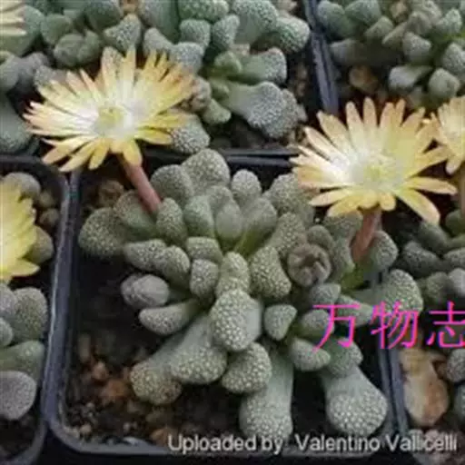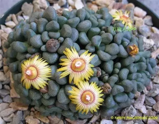 番杏科菱鲛属植物。产于南非开普省。小型的多年生肉质草本。有肉质根,几乎无茎。叶8一10,近似匙 唐扇 形,先端钝圆的三角形,肉质比叶下部明显厚,蓝绿色。叶总的来说很小,排列成松散的莲座形。植株丛生,具肥大的肉质根,无茎。叶8~10枚直接从根基部长出,排列成松散的莲座状,叶肉质,很小,近似匙形,先端为浑圆的三角形,叶蓝绿或褐绿色,密布深色舌苔状小疣突。花朵直径1~2厘米,花色黄、红相间,有丝绸般的光泽。花期春末夏初,通常在阳光充足的午后开放,傍晚闭合,第二天照旧开放、闭合,如此昼开夜闭,单朵花可持续开放3~5天。