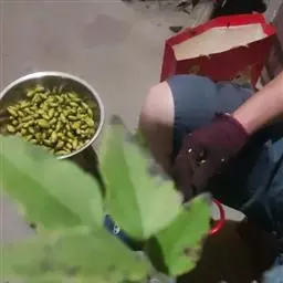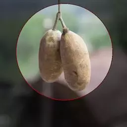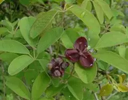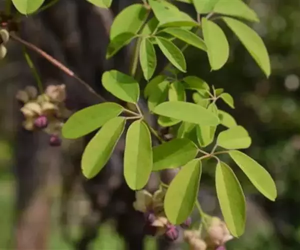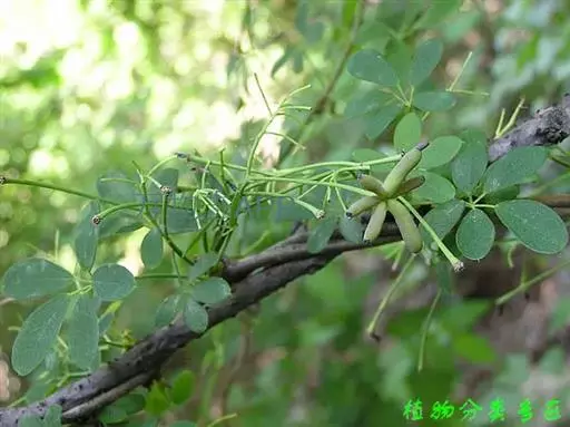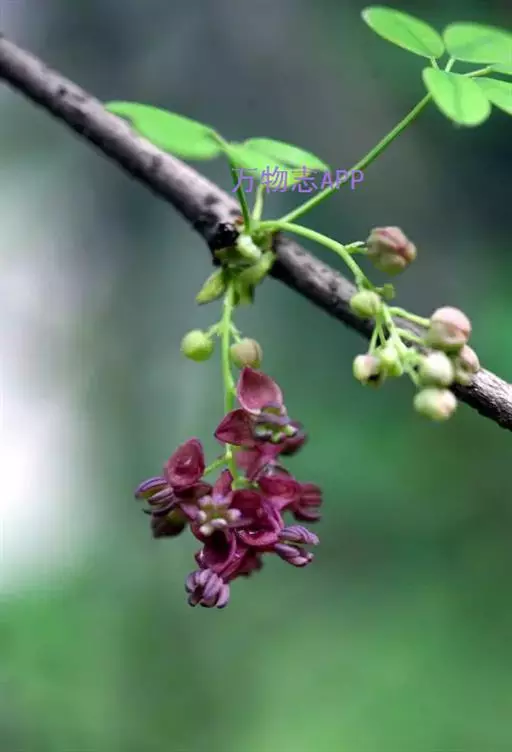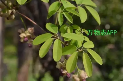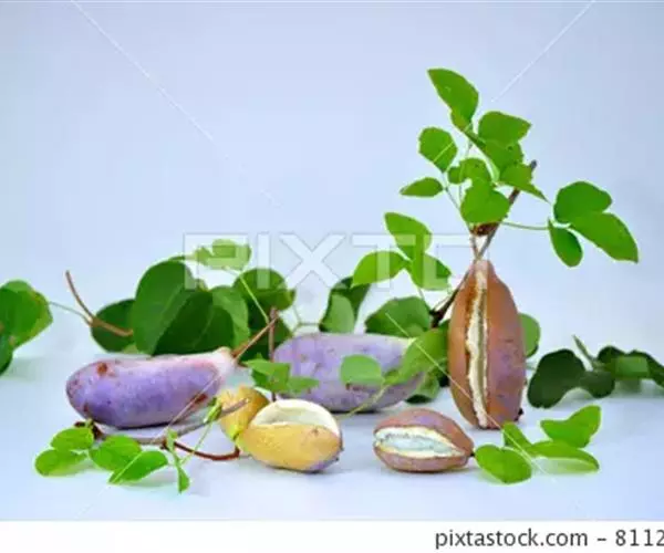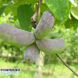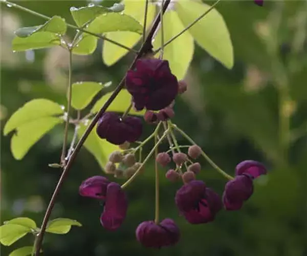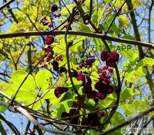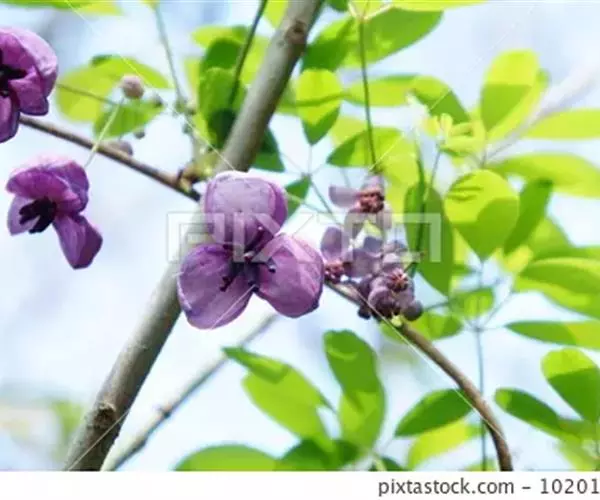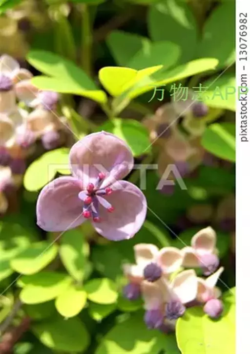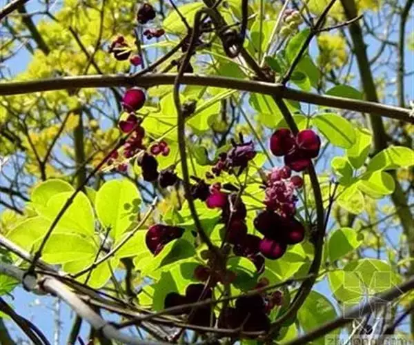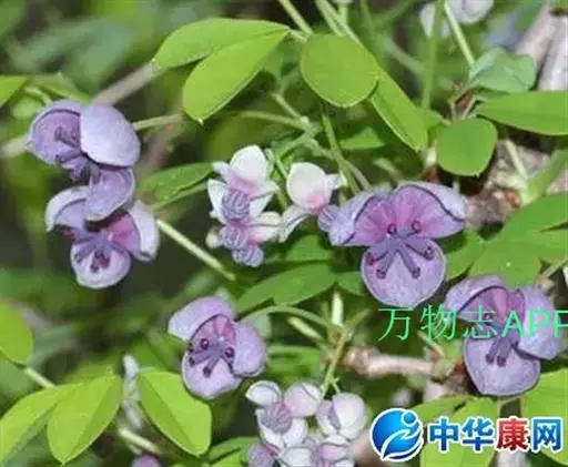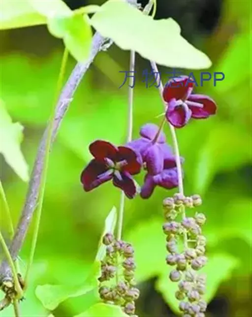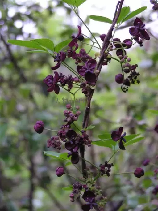 植物五叶木通,别名木通《中国植物志》。落叶木质缠绕藤本,长3~15米,全体无毛。幼枝灰绿色,有纵纹。掌状复叶,簇生于短枝顶端;叶柄细长。夏季开紫色花,短总状花序腋生。果肉质,浆果状,长椭圆形,略呈肾形,两端圆,长约8厘米,直径2~3厘米,熟后紫色,柔软,沿腹缝线开裂。种子多数,长卵形而稍扁,黑色或黑褐色。