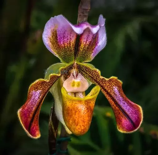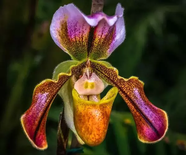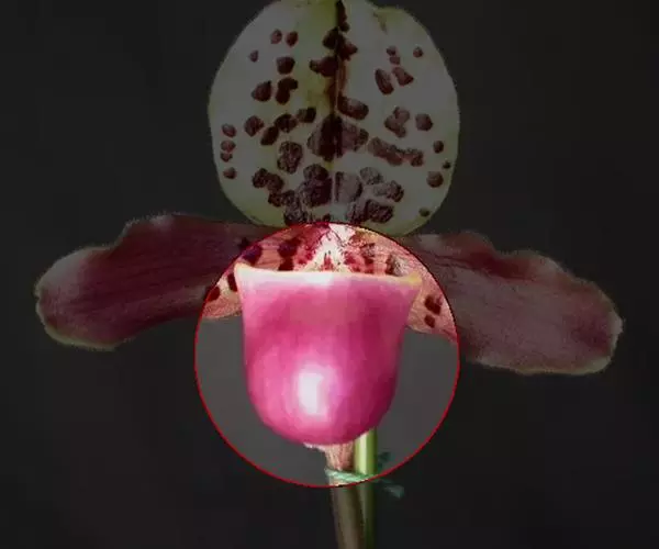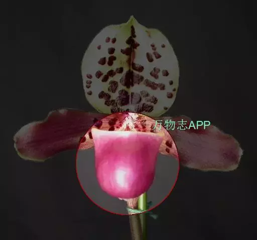 花葶直立,长20-30厘米,通常绿色并被深紫色长柔毛,基部常有长鞘,顶端生1花;花苞片宽卵形,长8-15毫米,宽8-11毫米,先端钝,背面密被长柔毛,边缘具长缘毛;花梗和子房长4-5厘米,具6纵棱,棱上密被长柔毛;花较大,中萼片和合萼片除边缘淡绿黄色外,中央至基部有浓密的紫褐色斑点或甚至连成一片,花瓣下半部黄绿色而有浓密的紫褐色斑点,上半部玫瑰紫色并有白色晕,唇瓣淡绿黄色而有紫褐色小斑点,退化雄蕊与唇瓣色泽相似,有2个白色“眼斑”;中萼片宽卵形或宽卵状椭圆形,长3.5-4厘米,宽3-3.5厘米,先端钝,背面被疏柔毛,边缘具缘毛;合萼片卵形,长3-3.5厘米,宽1.8-2.5厘米,亦具类似的柔毛与缘毛。