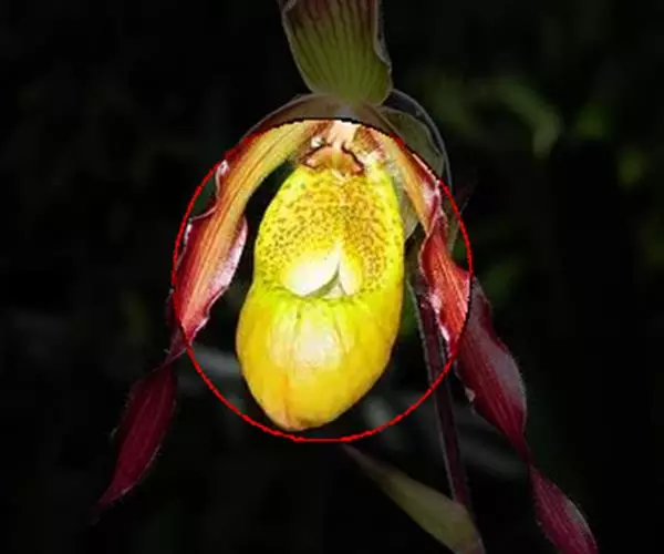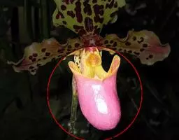 花瓣匙形或狭长圆状匙形,长5-7.5厘米,宽2-2.5厘米,先端常近截形或微凹,稍扭转,下部边缘皱波状且上面有时有黑色毛,边缘有缘毛,内表面基部有毛或近无毛;唇瓣倒盔状,基部具宽阔的、长约1.5厘米的柄;囊椭圆状圆锥形或近狭椭圆形,长2.5-3.5厘米,宽2-2.5厘米,囊口极宽阔,两侧各有1个直立的耳,两耳前方边缘不内折,囊底有毛;退化雄蕊近正方形,长与宽各8-10毫米,顶端近截形或有极不明显的3裂,基部有钝耳,上面中央和基部两侧各有1枚突起物,中央1枚较大,背面有龙骨状突起。花期4-5月。