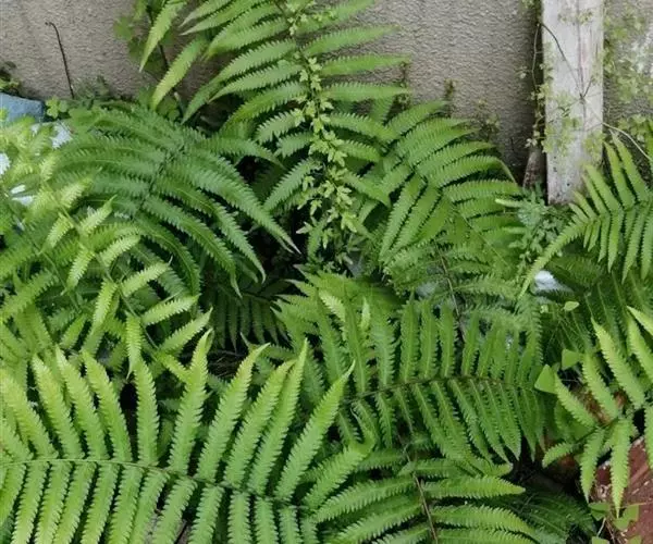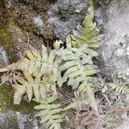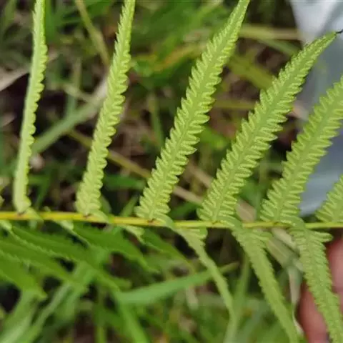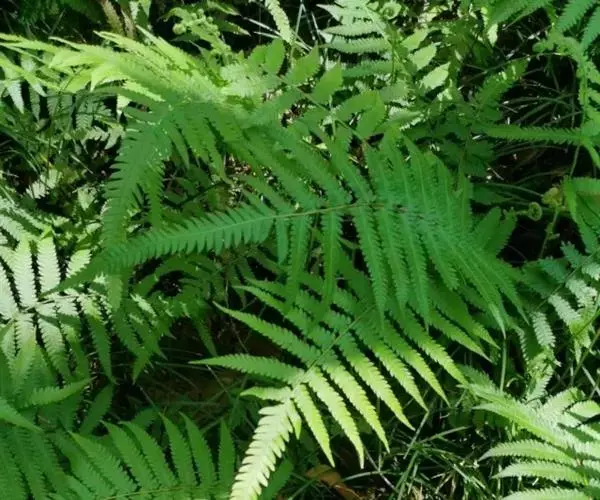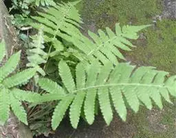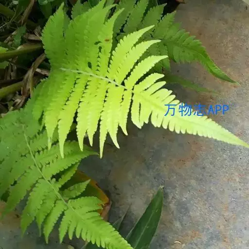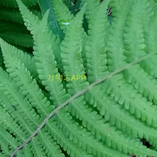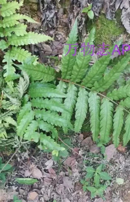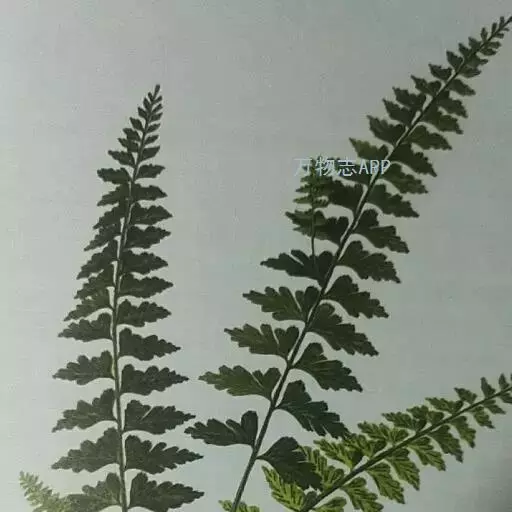 毛蕨 植株高达130厘米。根状茎横走,粗约5毫米,黑色,连同叶柄基部偶有一二卵状披针形鳞片。叶近生;叶柄长约70厘米,粗2~3毫米,基部黑褐色,向上渐变为禾秆色,几光滑;叶片长约60厘米,宽20~25厘米,卵状披针形或长圆披针形,先端渐尖,并具羽裂尾头,基部不变狭,二回羽裂;羽片22~25对,顶生羽片长约5厘米,基部宽约1.8厘米,三角状披针形,渐尖头,基部阔楔形,柄长约5毫米,羽裂达2/3,侧生中部羽片几无柄,斜向上,互生(基部的对生),相距约2厘米,近线状披针形,先端渐尖,基部楔形,对称,羽裂达1/3;裂片约30对,斜展,长宽各约3~4毫米,三角形,尖头。叶脉下面明显,每裂片有侧脉8~10对,基部一对斜展,其上侧一脉出自主脉基部,下侧一脉出自羽轴,二者先端交结成一个钝三角形网眼,并自交结点向缺刻下的膜质联线伸出外行小脉;第二对侧脉斜伸到膜质联线,在主脉两侧形成两个斜长方形网眼;第三对侧脉伸达缺刻以上的叶边。叶近革质,干后褐绿色,上面光滑,下面沿各脉疏生柔毛及少数橙红色小腺体,并沿羽轴有一二淡棕色鳞片;鳞片膜质,阔卵形,有缘毛。孢子囊群圆形,生于侧脉中部,每裂片5~9对,下部1~2对不育,因此在羽轴两侧各形成一条不育带;囊群盖小,膜质,淡棕色,上面疏被白色柔毛,宿存,成熟时隐没于囊群中。染色体2n=72,144。
