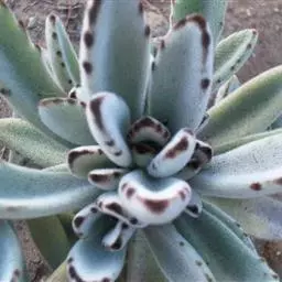 褐斑伽蓝是景天科、伽蓝菜属多年生肉质草本植物或小灌木。全株灰白色,密布白色茸毛。叶片长卵形,…