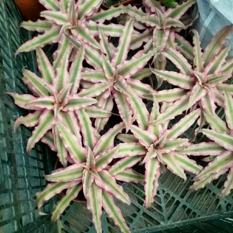 彩叶凤梨 L.B.Sm.) 凤梨科多年生常绿草本。株高25-30厘米,茎短。叶革质,带状,常基生,…