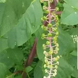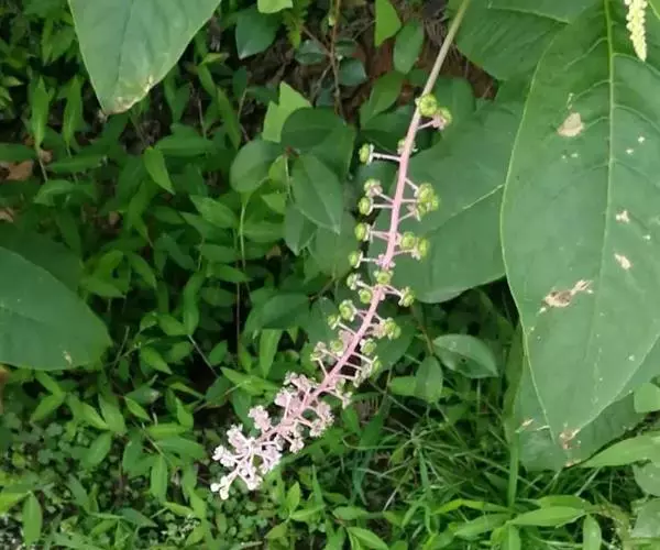垂序商陆(学名:Phytolacca americana L.)是商陆科,商陆属植物多年生草本植物,高可达2米。根粗壮,肥大,茎直立,圆柱形,叶片椭圆状卵形或卵状披针形,顶端急尖,基部楔形;总状花序顶生或侧生,花白色,微带红晕,心皮合生。果序下垂;浆果扁球形,种子肾圆形,6-8月开花,8-10月结果。