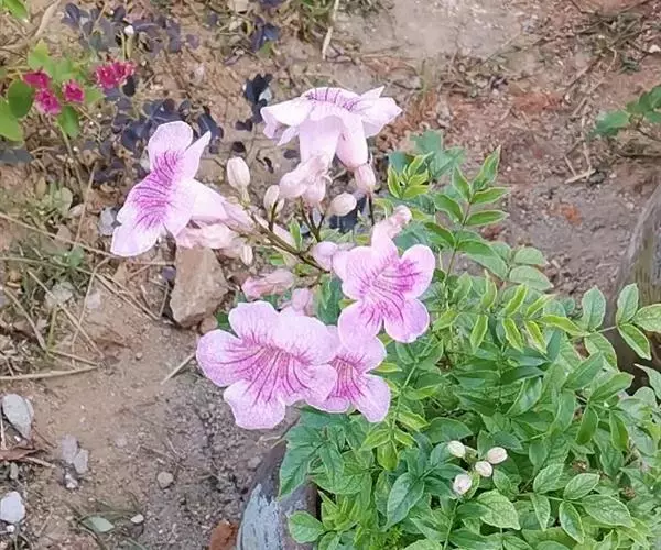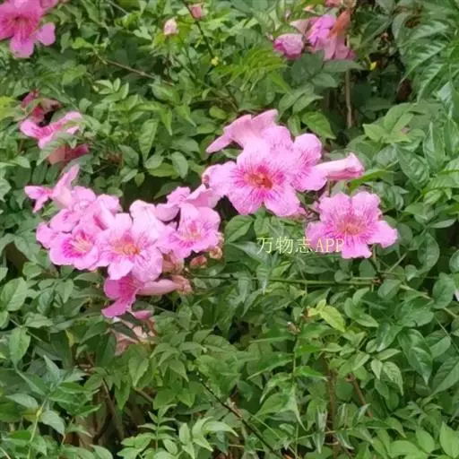 非洲凌霄(学名:Podranea ricasoliana (Tanfani) Sprague)是紫葳科非洲凌霄属植物。常绿半蔓性灌木,自然独立生长状态下,高1米左右,少数达到2米。叶对生,奇数羽状复叶,叶柄具凹沟。花期秋至翌茸春季,圆锥花序顶生,花冠漏斗状钟形,先端5裂,粉红到紫红色,喉部色深,有时带有紫红色脉纹。