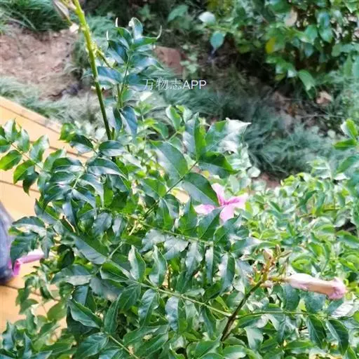 常绿半蔓性灌木,自然独立生长状态下,高1米左右,少数达到2米。叶对生,奇数羽状复叶,叶柄具凹沟,小叶通常11枚,也有9枚或13枚。小叶长卵形,长4-6厘米,先端尖,叶缘具锯齿,叶柄基部紫黑色。花期秋至翌茸春季,圆锥花序顶生,花冠漏斗状钟形,先端5裂,粉红到紫红色,喉部色深,有时带有紫红色脉纹。