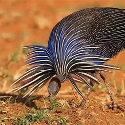 鹫珠鸡:是珠鸡科中体形最大的一种,因头颈部像兀鹫而得名。雌雄羽色相似,为黑色基底上遍布白色点斑,…