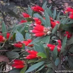 羊毛杜鹃(学名:Rhododendron mallotum Balf. f. et K. Ward):常绿灌木或小乔木,高3-6米;小枝粗壮,直径7-9毫米,密被黄锈色绒毛,老枝无毛。叶厚革质,坚硬,宽倒披针形至倒卵形,上面暗深绿色,下面红褐色。顶生紧密的伞形花序,有花7-14朵;花冠管状钟形,长约4厘米,直径近4厘米,肉质,暗深红色,内面基部有5枚黑红色的密腺囊,裂片5,扁圆形。蒴果圆柱形,斜生果梗上,微弯曲,有浅肋纹及褐色绒毛。花期5-6月,果期8-11月。