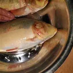 ⒉收拾青鱼的窍门:右手握刀,左手按住鱼的头部,刀从尾部向头部用力刮去鳞片,然后用右手大拇指和食指将鱼鳃挖出,用剪刀从青鱼的口部至脐眼处剖开腹部,挖出内脏,用水冲洗干净,腹部的黑膜用刀刮一刮,再冲洗干净。