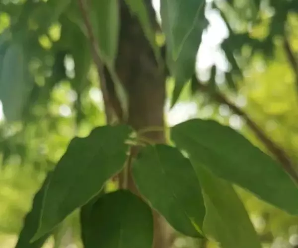 常绿乔木,常高10米,稀达20米。树皮灰色或深灰色,粗糙,裂成薄片脱落。小枝细瘦,近于圆柱形;当年生嫩枝紫色或紫绿色,近于无毛;多年生老枝褐色或深褐色。冬芽小,褐色,近于无毛。叶革质,长圆卵形,长5-7厘米,宽3-4厘米,全缘,基部钝形或近于圆形,先端渐尖或钝尖;下面有白粉;主脉在上面显著,在下面凸起,侧脉6-7对,基部的一对侧脉较长,其长度约为叶片的1/3-1/2,小叶脉显著,成网状;叶柄长2-3厘米,黄绿色,无毛。