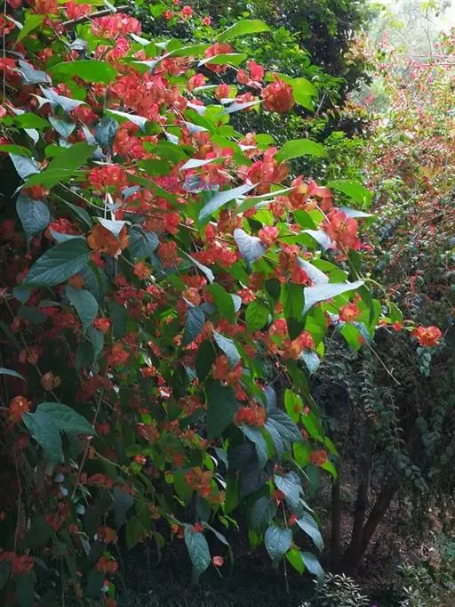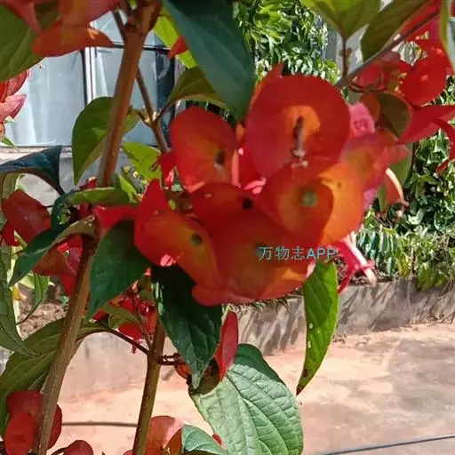 冬红( Holmskioldia sanguinea Retz. )为马鞭草科( Verbenaceae )冬红属( Holmskioldia )植物,又名阳伞花、帽子花,从冬红这个名字的表面字义来看,说明它的花在冬季依然能开放出绚丽的红色。冬红花顶生,花萼伞形,花冠喇叭形,橙红色,盛开时极为鲜艳夺目。它的枝条伸长具蔓性,可修剪成灌木。冬季忌潮湿,干旱有利开花,花后进行强剪,促使其萌发新枝。性喜高温,生长适温 23—3 2 ℃ , 适用于花架、花廊或盆栽。冬红在热带地区,用于园林绿化,诱引于花架或墙壁上。亚热带、温带地区可作温室盆栽。