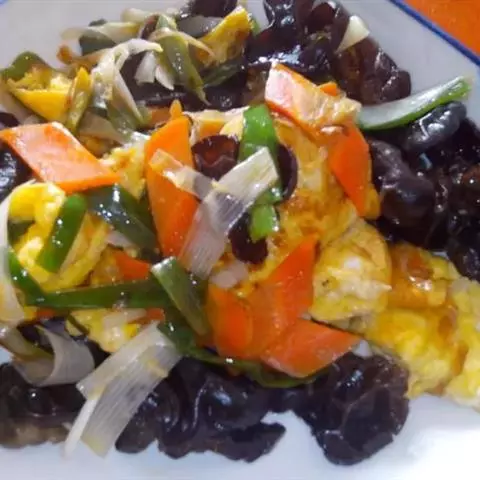 平底锅,热锅倒入油,在油中放入八角和辣椒,无油的地方放入蒜瓣和Dried Mixed Herbs,油开始冒泡后,在无油的地方放入切成细条状得西芹,然后加入黑胡椒后翻炒2分钟,放滚刀切好的大葱,加入甜鸡酱后,再放入木耳,稍微翻炒后,盖上盖子3分钟左右,加入黑胡椒,少量盐,加入热水,大火沸煮,水差不多收干后,再加入盐,加少量沸水,收汁时再加一次甜鸡酱和黑胡椒,关火盖盖,焖3分钟后装盘.