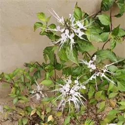 春季枝头悬挂淡紫色小花,很多也很漂亮,花期1个月左右。叶片全年呈现出淡淡的蓝灰色,远远望去与其他植物形成鲜明的对照。