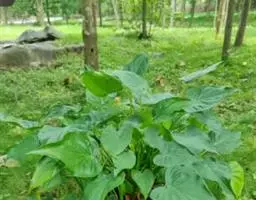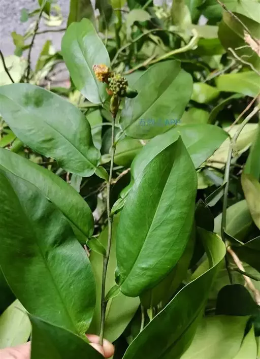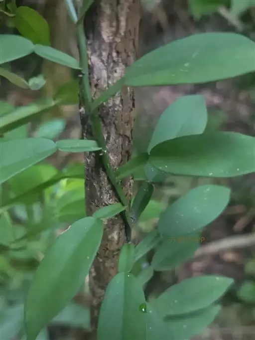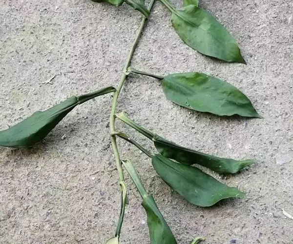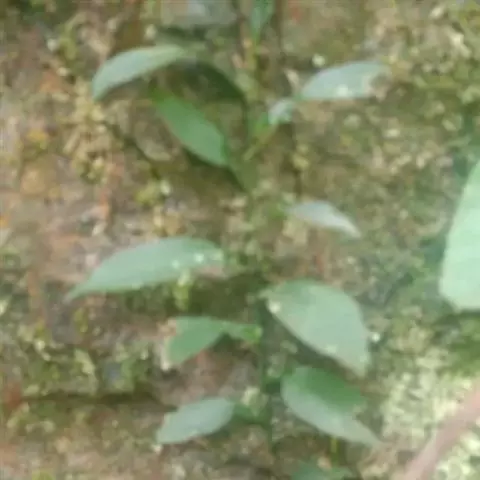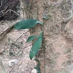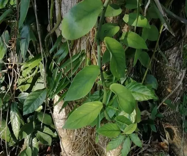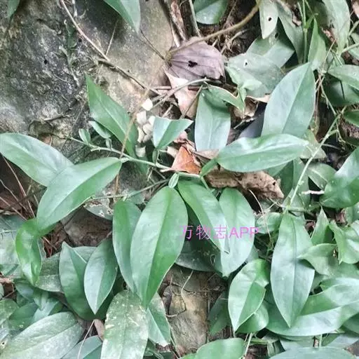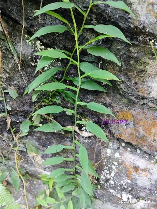 石柑子(Pothos chinensis (Raf.) Merr.):又名竹结草、爬山虎、巴岩香、百步藤。是单子叶植物纲、天南星科、石柑属附生藤本。茎亚木质,淡褐色,近圆柱形,具纵条纹,节上常束生长1-3厘米的气生根;分枝;叶片纸质,长6-13厘米,宽1.5 5-5.6厘米;中肋在表面稍下陷,背面隆起,侧脉4对;叶柄倒卵状长圆形或楔形,长1-4厘米,宽0.5-1.2厘米。花序腋生,基部具苞片4-5枚;苞片卵形,长5毫米;浆果黄绿色至红色,卵形或长圆形,长约1厘米。花果期四季。