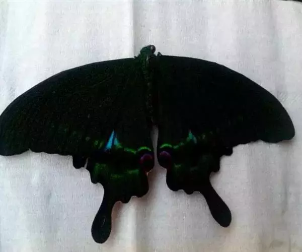 成虫期——雄蝶前翅端稍尖,整体外观呈三角形,外横线各翅室有金绿色斑纹排列成带状,前翅 1b 及 第 2 室有黑色毛状性征。后翅外缘呈波浪状,具尾状突起,第 4~6 室有金绿色大型块状斑,肛角具暗红色弦月纹,后翅内缘轻微反卷,有细长黑色鳞毛。雌蝶体型较大,外观与雄蝶相似。成虫翅表底色为黑色,翅表布满金绿色鳞片。本种为大型蝶种,展翅约为 7.0~8.0 cm,有蜘蛛、螳螂、青蛙、蜻蜓、鸟类等捕食性天敌。