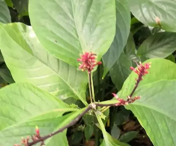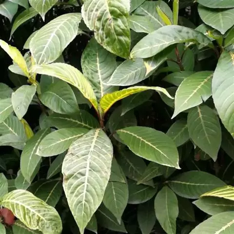 灌木,高达3米。叶椭圆形至矩圆形,长12-30厘米,宽9-15厘米,顶端尖至渐尖,基部宽楔形,下延,具柄,柄长1.5-5厘米,叶片上面密生小点状钟乳体,光滑无毛,背面被微毛,脉上毛较密而明显,侧脉12-17对。