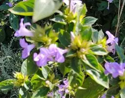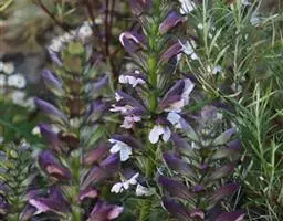 聚伞圆锥花序穗状,顶生,长14-18厘米,宽6-8厘米;花具梗,梗长5-8米米,密被短绒毛;苞片和小苞片微小;花萼5裂至下部,基部联合,裂片三角状披针形,长约5-7米米,密生微毛;花冠紫红色,长约5厘米,外密被倒生黄褐微毛和腺毛,花冠管长约4.2厘米,略向下弯,冠檐2唇形,上唇2裂,下唇3深裂;雄蕊2,着生近花冠管基部,稍外露,花药2室,背着生,椭圆形,花丝基部附近有2退化雄蕊的残迹。蒴果长,圆柱形,约3.5厘米,具10粒种子。