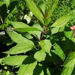 叶对生,有时上部的叶近互生,宽或长卵形,或三角状卵形,中部茎叶长2-6厘米,宽1.5-3.5厘米,或长宽相等。自中部向上及向下和腋生的叶渐小或小。全部叶有叶柄,柄长0.7-3厘米,边缘有规则的圆锯齿,齿大或小,或密或稀,顶端圆形或急尖,基部心形或平截,三出基脉或不明显五出脉,两面被稀疏或稠密的白色柔毛,下面及脉上的毛较密,上部叶的叶柄、腋生幼枝及幼枝叶的叶柄通常被开展的白色长绒毛。