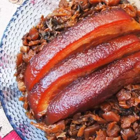 梅菜扣肉,汉族传统名菜,属客家菜 。制作材料有五花肉、梅菜、葱白、姜片等。