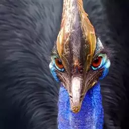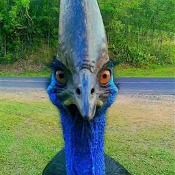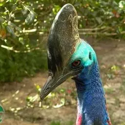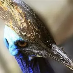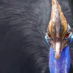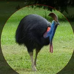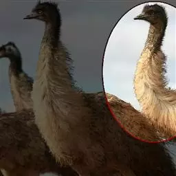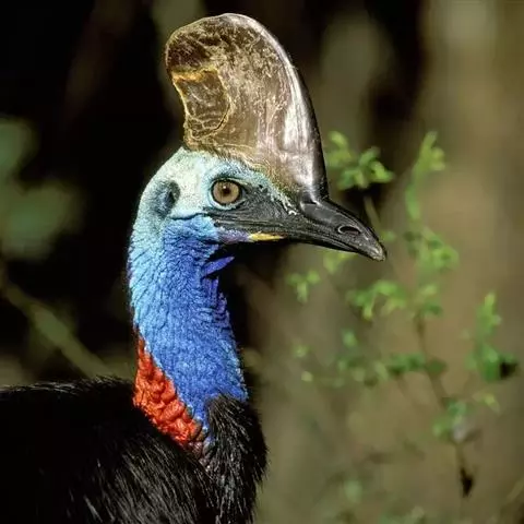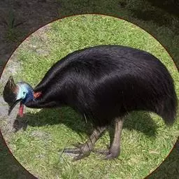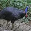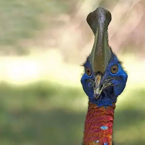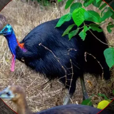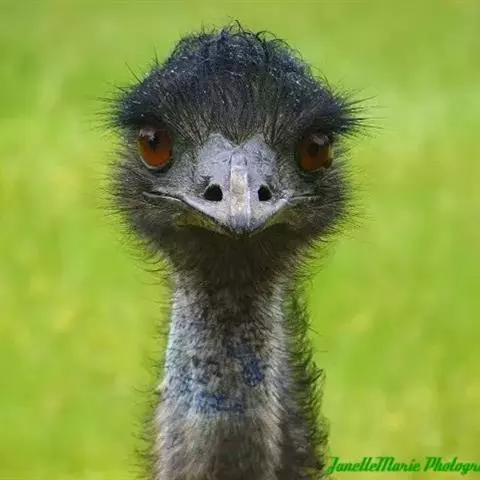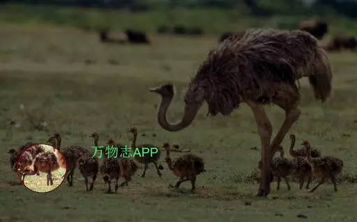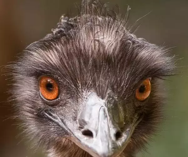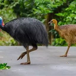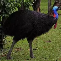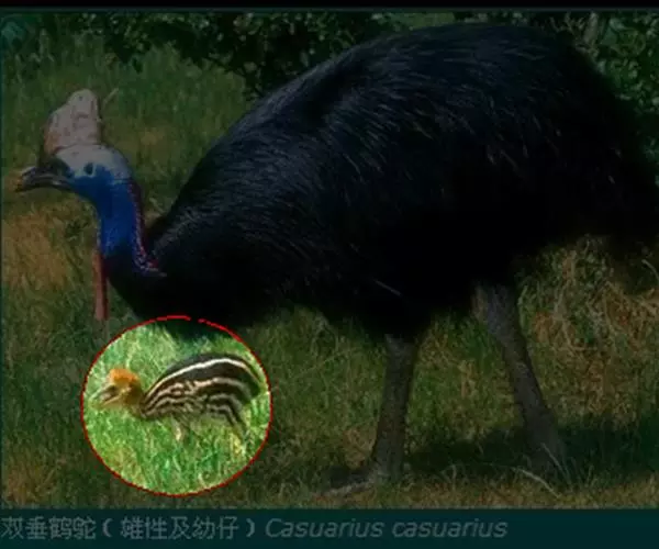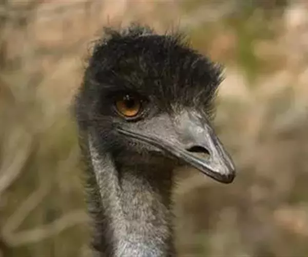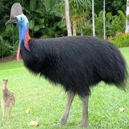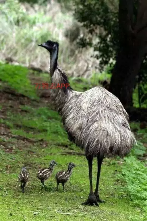 鸸鹋,体高150-185厘米,体重30-45千克,寿命10年。成年雌性比雄性大。鸸鹋形似非洲鸵鸟而较小,属于平胸类,没有龙骨,嘴短而扁,羽毛灰色、褐色或黑色,长而卷曲自颈部向身体的两侧覆盖。翅膀退化,完全无法飞翔。足三趾,腿长善走。羽毛发育不全,具纤细垂羽,副羽甚发达,头、颈有羽毛、无肉垂。体健壮,腿长,同其亲属鹤鸵一样。两性体羽均为褐色,头和颈暗灰,颈部裸露的皮肤呈蓝色,喙为灰色,翅膀隐藏在残留的羽毛下,在炎热的天气,可以促进机体冷却。庞大的身体是由两个强大的灰色的三趾腿支撑。雏鸟有一个蓬松羽毛的头,身体由棕色和黑色条纹的羽毛组成。鸸鶓的跑速每小时可达50千米,被困时用三趾的大脚踢人。