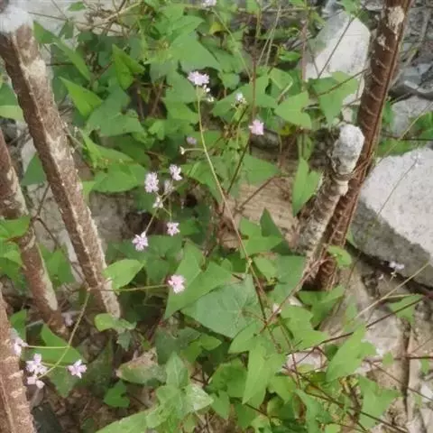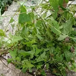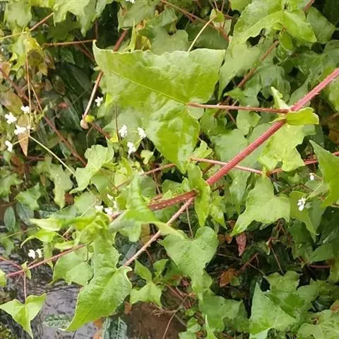 杠板归,一年生攀援草本。其茎略呈方柱形,有棱角,多分枝,直径可达0.2cm;表面紫红色或紫棕色,棱角上有倒生钩刺,节略膨大,节间长2~6cm,断面纤维性,黄白色,有髓或中空。叶互生,有长柄,盾状着生;叶片多皱缩,展平后呈近等边三角形,灰绿色至红棕色,下表面叶脉和叶柄均有倒生钩刺;托叶鞘包于茎节上或脱落。短穗状花序顶生或生于上部叶腋,苞片圆形,花小,多萎缩或脱落。气微,茎味淡,叶味酸。常生于山谷、灌木丛中或水沟旁。