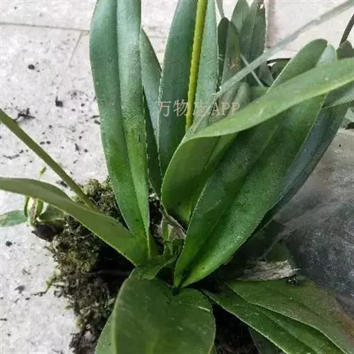 附生植物,较高大。叶基生,二列,2-5枚;叶片宽带形或舌状,厚革质,干后常呈棕红色,长15-30厘米,宽3-5厘米,先端近浑圆并有裂口或小弯缺,背面中脉呈龙骨状突起,无毛,基部收狭成叶柄状并对折而彼此套叠,长度一般可达6-7厘米。