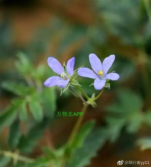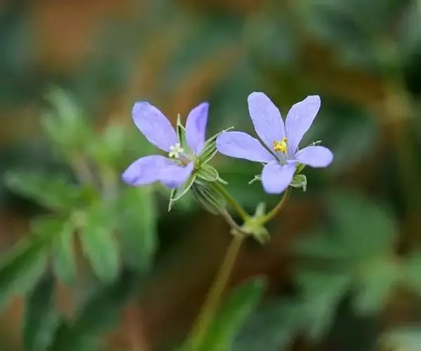 一年生草本,高7-15厘米,全株被灰白色柔毛。茎仰卧或基部仰卧,下部多分枝。叶对生;托叶钻状,长约2毫米,被短柔毛;基生叶和茎下部叶具长柄,柄长5-6厘米;叶片长卵形或三角状卵形,长15-25毫米,宽10-15毫米,不分裂,边缘具不整齐的圆齿,或通常3深裂,中裂片较大,长卵形,边缘具浅裂状圆齿,侧裂片较小,边缘为不规则圆齿,表面密被短柔毛,背面被短绒毛;茎上部叶柄较短,叶片较小,裂片有时全缘。总花梗腋生或顶生,长2-3厘米,密被短绒毛,每梗具2花或有时1-3花;花梗与总花梗相似,长为总花梗的1半或近等长;萼片椭圆形或椭圆状卵形,长5-6毫米,先端圆形,具短尖头,背面密被短柔毛;花瓣紫红色,倒卵形,与萼片近等长;雄蕊中部以下扩展。蒴果椭圆形,长5-6毫米,宽3-4毫米,被开展或稍向上的长柔毛,上部通常具横沟纹;喙长达7-9厘米,易脱落,成熟裂开后呈羽毛状。花期4-5月,果期5-6月。