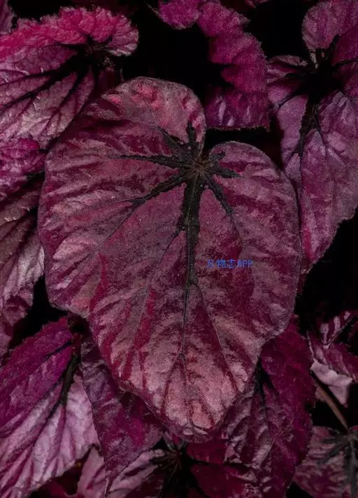叶玫瑰红色,中心深紫红色,周围具白色斑纹,主脉红色。