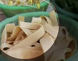 (2)到将鱼胶、腊肠、肥猪肉、鸡蛋白、精盐、味精放进豆腐盆内,用手搅拌均匀。再加入葱白、方鱼末、生粉、澄面粉、胡椒粉、麻油,再搅拌均匀。取4张薄保鲜纸,每张20厘米X 20厘米,抹上生油,把已调好味的豆腐泥分成4份,分别放在已抹油的保鲜纸上抹平,抹成日字形薄状,包起放进电冰箱冻至稍变硬。