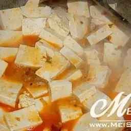做法:先用刀尖顺着盒子的四壁轻轻地划一圈,然后把豆腐盒倒扣在菜板上,白嫩嫩的豆腐就可以完整地取出来了。将豆腐切成5cm见方的大块,切的时候力度要柔一些。