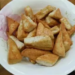 (3)将炒鼎洗净,烧热放入生油,待油热至约180℃时,将保鲜纸拆开,把豆腐放在铝筛上,放进油鼎内炸至金黄色,使其熟透,然后切件盛上餐盘便成。