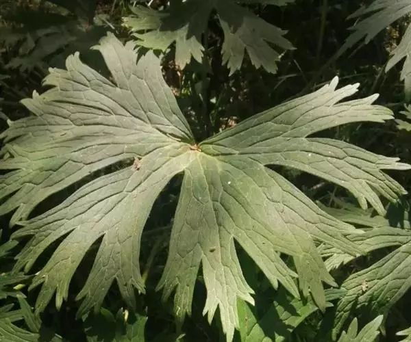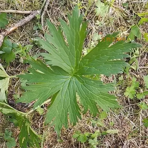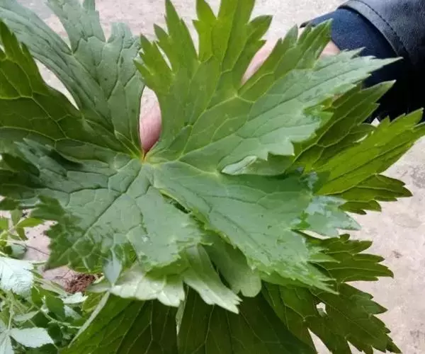 多年生草本植物,根长达20厘米,圆柱形,粗达2厘米。茎高(60-)95-150厘米,中部以下几无毛,上部近花序处被反曲的短柔毛,生4-6枚叶,不分枝或分枝。基生叶1枚,与茎下部叶具长柄;叶片肾形或圆肾形,长12-14.5厘米,宽20-28厘米,基部宽心形,三深裂约至本身长度的6/7处,中深裂片较小,楔状狭菱形,渐尖,三裂边缘有不整齐的三角形锐齿,侧深裂片斜扇形,不等三裂稍超过中部,两面疏被短柔毛或变无毛;叶柄长30-50厘米,具浅纵沟,几无毛。