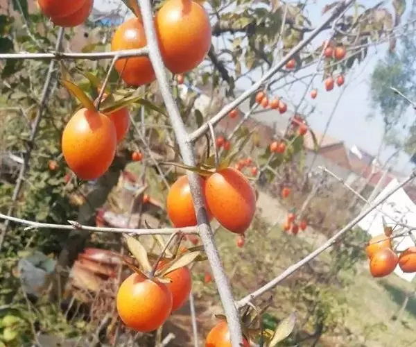 果单生,球形,直径约2厘米,嫩时黄绿色,有柔毛,后变橙黄色,熟时桔红色,有蜡样光泽,无毛,顶端有小突尖;有种子2-4颗;种子褐色,半球形或近三棱形,长约1厘米,宽约6毫米,背部较厚,宿存萼4深裂,裂片革质,长圆状披针形,长1.6-2厘米,宽4-6毫米,先端急尖,有明显的纵脉;果柄纤细,长1.5-2.5厘米。花期4-5月,果期9-10月。 [1-2]