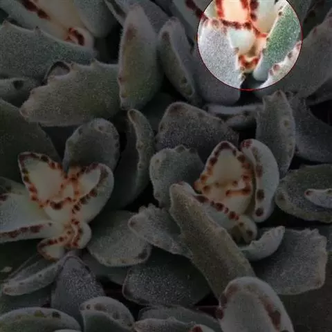 褐斑伽蓝是景天科、伽蓝菜属多年生肉质草本植物或小灌木。全株灰白色,密布白色茸毛。叶片长卵形,…