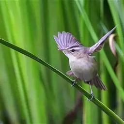 大苇莺:属小型鸟类,雌雄两性羽色相似。眉纹淡棕黄色;眼褐色;翅褐色具淡棕色的边缘;尾羽亦褐色,…