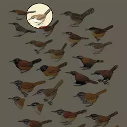 花彩雀莺:体长9-12厘米,是一种毛茸茸偏紫色的雀莺。顶冠棕色,眉纹白。尾长,羽毛松软。…