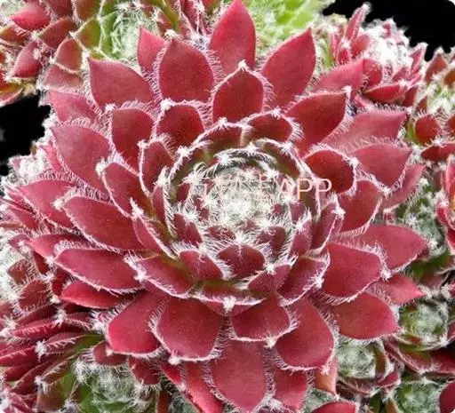 植株莲座形,莲座叶盘很小,但易群生呈垫状生长,因此在原产地每株占地面积较大。叶排列紧密,绿色中带红色,叶尖有白毛,在植株顶部联结如蛛网。叶元柄,倒卵形;粉红花,直径2厘米左右。