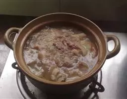 2、汤锅内加清水4000克,置旺火上,将鸭骨架、猪肉、藕、冬菇、干笋、海米、葱、姜、料酒、糖同时放入汤锅,待汤开后,再用微火煮1小时。再放细盐、栗子、莲子、红枣煮1小时即可起锅。上桌时加入味精。