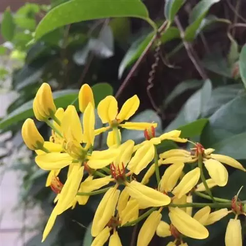 木质藤木,长达10米。叶对生,纸质或亚革质,卵形,长6—12厘米,宽4—7厘米,先端急尖至渐尖,基部 圆形至心形,与叶柄交界处有2腺体,全缘,略反褶但不具腺体,无毛;叶柄长1—1.5厘米;托叶线形至披针形,长约1毫米,急尖。总状花序顶生或腋生;花梗长1.5—3厘米,中部以下具关节;花鲜黄色,直径2—2.5厘米;萼片三角形,长3毫米,宽1.5毫米;花瓣椭圆形,长8—13毫米,宽5—6毫米,爪长2—3毫米;雄蕊长3—4毫米。星芒状翅果直径1—2厘米。花期8月,果期10月。