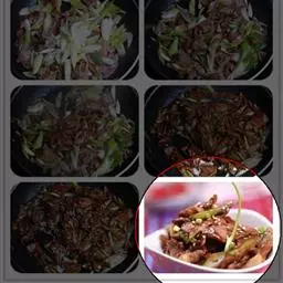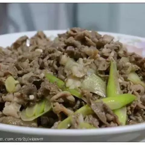 4. 待肉片变色后,放入葱块、精盐、味精、米醋(醋忌与羊肉一同食用!)、酱油拌炒