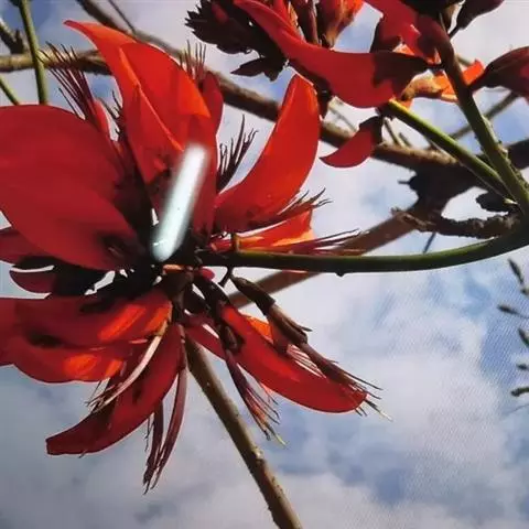龙牙花(学名:Erythrina corallodendron L.):是一种灌木或落叶小乔木植物,高约3-15米,树冠阔度可达3.5米。树皮粗糙,灰褐色;树干及枝条疏生粗壮的黑色瘤状皮刺,老枝无刺。叶为三出羽状复叶,互生;叶柄无毛,淡红色,有时上和下面中脉上疏生倒钩状小皮刺,长约6-12厘米;顶生小叶较侧生小叶为大,侧生小叶基部略偏斜;小叶菱状卵形或菱形,顶端尾状或渐尖而钝,基部宽楔形或近截形或近圆形,基部有一对腺体,全缘,两面无毛,有时背面的中脉上具小皮刺,长约4-10厘米,宽约2.5-8厘米;小叶柄无毛及中脉上有刺,长约3-5毫米;小托叶腺体状。