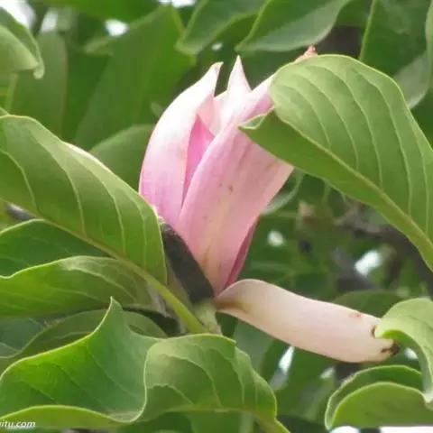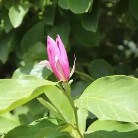‘红玉’玉兰(Magnolia ‘HongYu’)。玉灯玉兰和青皮玉兰的杂交品种。落叶小乔木,速生。花粉红色,基部桃红色,内轮颜色渐深。花被片12-16枚,内外几同形,径15-20厘米。花初开时灯泡状,盛开时莲花状。花期3月上旬,夏秋季会零星开花,花色较春季略淡。果少见。