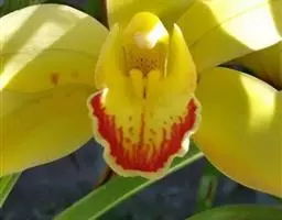 附生植物;假鳞茎狭卵球形,长2.5-5厘米,宽2-3厘米,稍压扁,包藏于叶基之内。叶(4-)5-7枚,带形,厚革质,长22-80厘米,宽1-1.8厘米,先端为不等的2圆裂或2尖裂,有时微缺,基部的鞘有宽1-1.5毫米的黑色膜质边缘。花葶从假鳞茎基部穿鞘而出,长17-28厘米,下垂或下弯;总状花序通常具10-20朵花;花苞片近三角形,长1.5-4.5毫米;花梗和子房长1-1.5厘米;花略小,直径3-4厘米;萼片与花瓣淡黄色至奶油黄色,中央有1条宽阔的栗褐色纵带,带宽达3-4毫米,唇瓣白色至奶油黄色,有栗褐色斑;萼片狭长圆形,长1.4-1.7(-2)厘米,宽3-5毫米;花瓣近狭椭圆形,长1.2-1.4(-1.7)厘米,宽3-4毫米;唇瓣近卵形,长1.2-1.4厘米,3裂,基部多少囊状,上面有小乳突或微柔毛;侧裂片短于蕊柱;中裂片外弯;唇盘上有2条纵褶片,不间断,两端略膨大,上面有小乳突或微柔毛;蕊柱长8-12毫米,略向前弯曲,有很短的蕊柱足;花粉团2个。蒴果近椭圆形,长3.5-5厘米,宽2.5-3厘米。花期3-4月。