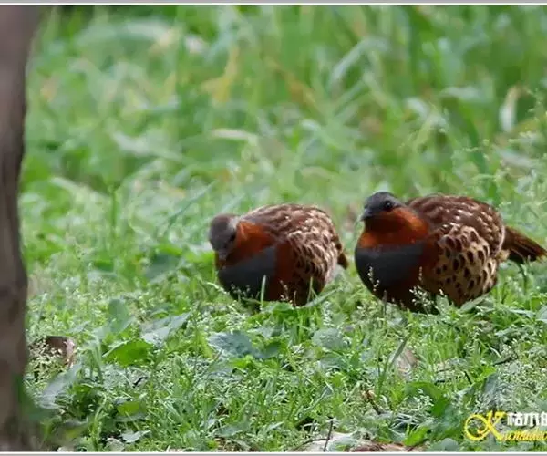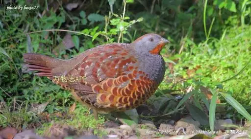 灰胸竹鸡 雄鸟额与眉纹灰色,有时额不为灰色而与头顶同色。眉纹粗著而长,向后一直延伸至上背。头顶和后颈橄榄褐色,具不甚明显的暗褐色纹。上背灰褐色,具不甚清晰的暗褐色虫蠹状斑和栗红色块斑;颊、耳羽及颈侧栗棕色;肩和下背橄榄褐色,密布黑色虫蠹状斑,并具有栗红色块斑和白色斑点。腰、尾上覆羽、翅上大覆羽和中覆羽以及三级飞羽橄榄褐色,密布黑色虫蠹状斑;腰和尾上覆羽末端中部缀一细的黑褐色点斑,有的点斑前部为淡栗色,后部为黑色;三级飞羽和大、中覆羽端部缀有棕黄色与栗色斑;大覆羽并具棕色端斑。初级飞羽、初级覆羽和次级飞羽暗褐色,初级飞羽外翈基部棕色,杂有黑色斑点;次级飞羽末端和外翈边缘淡棕色,具橄榄褐色斑点。中央尾羽红棕色,密杂以黑褐色和淡褐色虫蠹状横斑,外侧尾羽几纯红综色。头、颈两侧,以及颏、喉栗红色,前胸蓝灰色,向上伸至两肩和上背,形成环状,环后紧缘以栗红色,后胸、腹和尾下覆羽棕黄色 灰胸竹鸡 。两胁缀有黑褐色点斑或横斑。雌鸟和雄鸟相似,但稍小,且跗蹠无距。虹膜深棕色或淡褐色。嘴黑色,跗蹠和趾绿色或黄褐色。