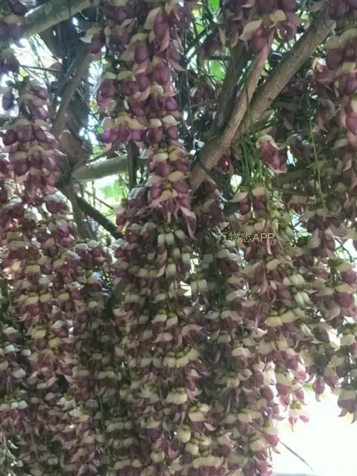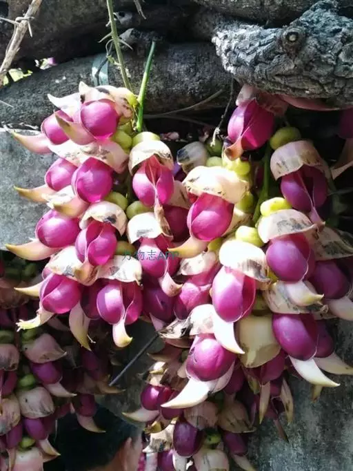 大果油麻藤(学名:Mucuna macrocarpa Wall.),因其茎内含有红色汁液,故又称为“血藤”。常利用枝干具有左右旋转的特性,缠住树干,螺旋式往上攀爬。叶为3出复叶,厚革质。总状花序多生于老茎上,花冠深紫色,旗瓣甚短,圆形,稍带绿白色。荚果。花期3-5月,果期6-7月。