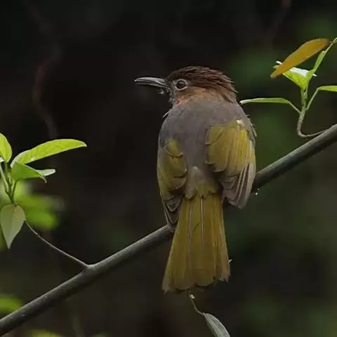 栗背短脚鹎,体长18-22厘米。上体栗褐,头顶和羽冠黑色。背栗色、翅和尾暗褐色具白色或灰白色羽缘。…