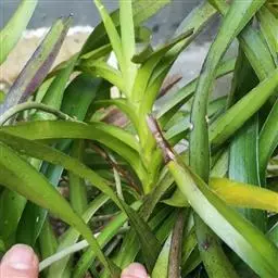 翠盖荷的植株属于中矮型草,一般叶长15cm左右,宽0.6cm~0.9cm。草型直立性好,中心叶常伴有扭曲状,底叶宽直,叶尖呈荷型草常见的钝头状,叶尖内扣且沟槽较深,叶脚短且收脚紧,叶缘锯齿极细。叶片较之宋梅明显纤薄,但叶色糯润有光泽。翠盖荷的新芽呈翠绿色,新芽的锋尖有细小白点,非常容易辨认。