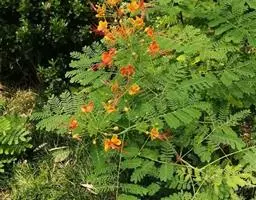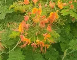 洋金凤 Sw.),豆科小凤花属灌木状或小乔木植物,枝无毛,绿或粉绿色;二回羽状复叶;总状花序伞房状,…