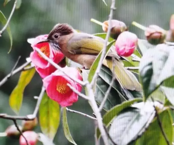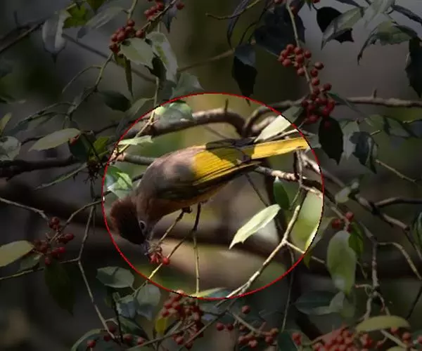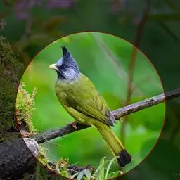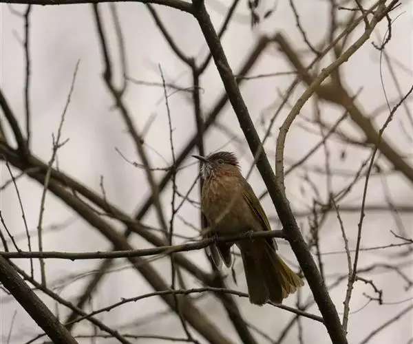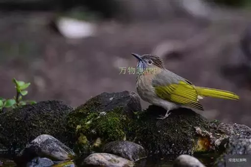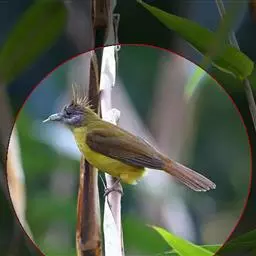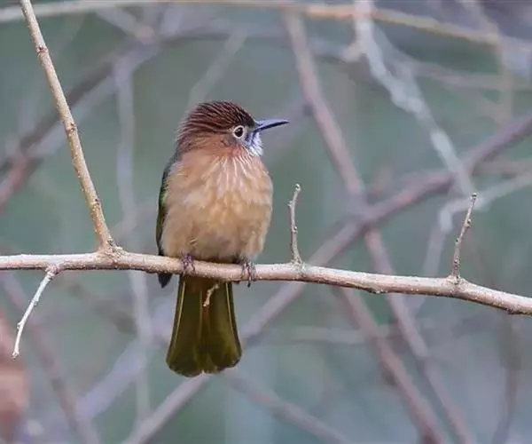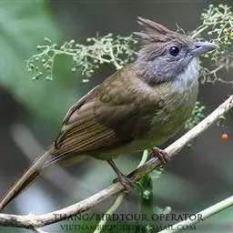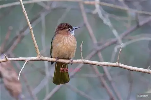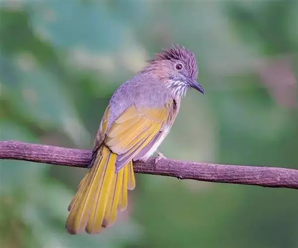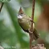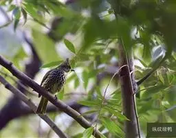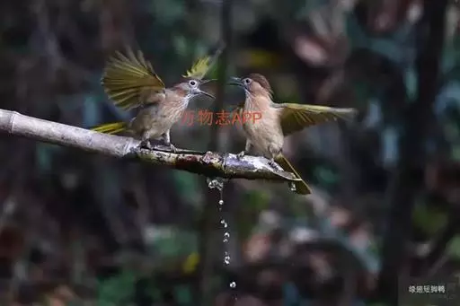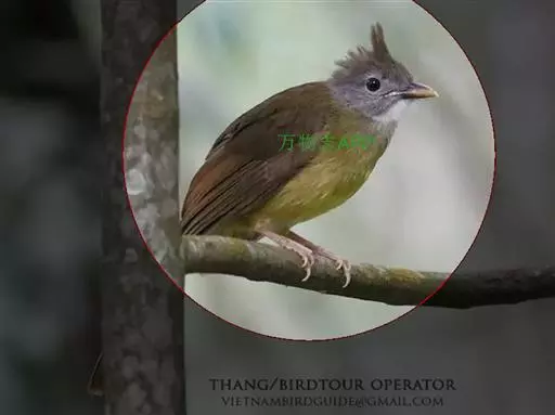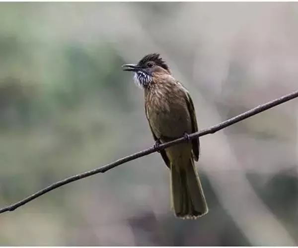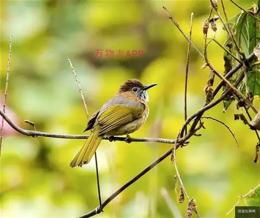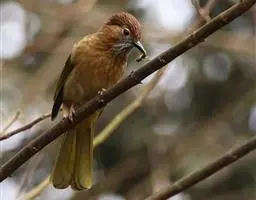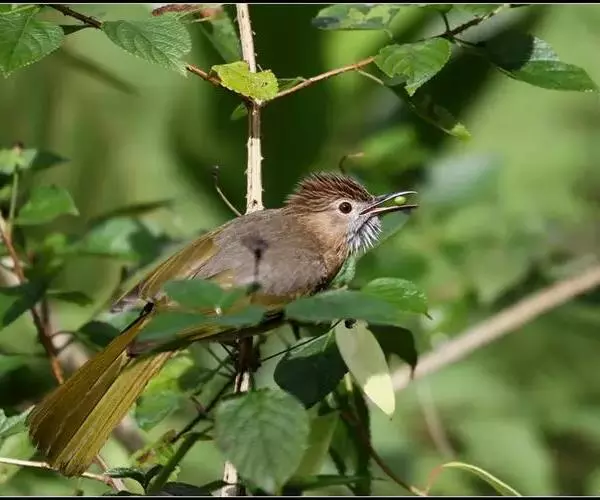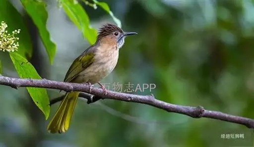 绿翅短脚鹎(学名:Hypsipetes mcclellandii):共有9个亚种。中型鸟类,体长20-26厘米。头顶羽毛形尖、栗褐色具白色羽轴纹,在暗色的头部极为醒目。上体灰褐缀橄榄绿色,两翅和尾亮橄榄绿色。耳和颈侧红棕色,颏、喉灰色,胸灰棕褐色具白色纵纹,尾下覆羽浅黄色。
